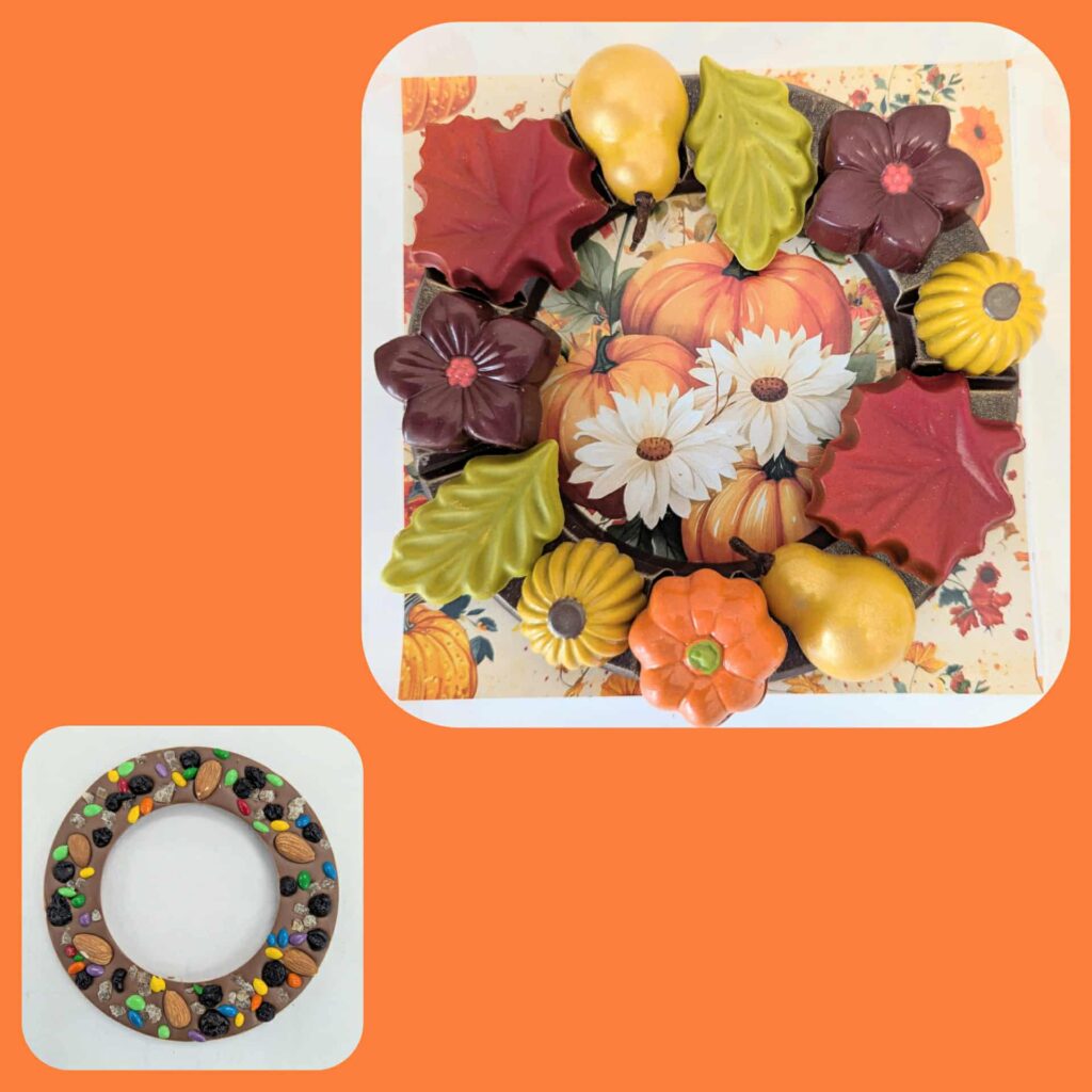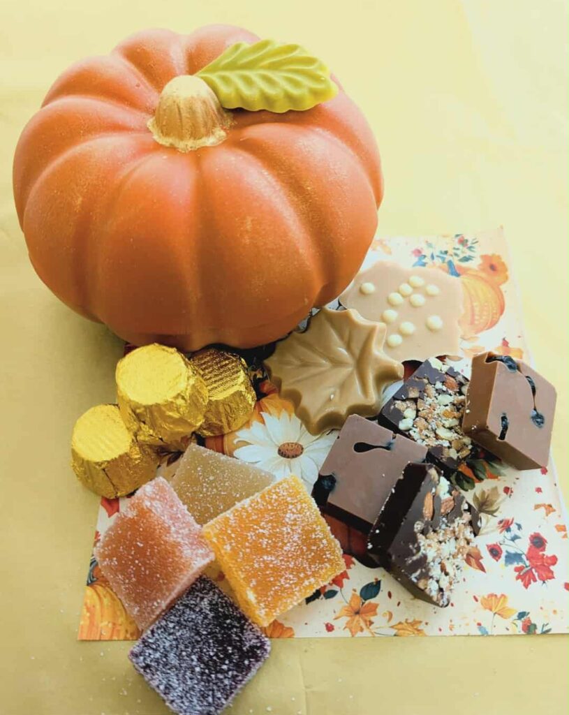 Each piece is a work of art: pear bonbons in white chocolate with vanilla bean ganache, purple flower bonbons of 54% chocolate with Biscoff, yellow flower bonbons of milk chocolate with dulce de leche, and pumpkin bonbons filled with silky milk chocolate caramel.